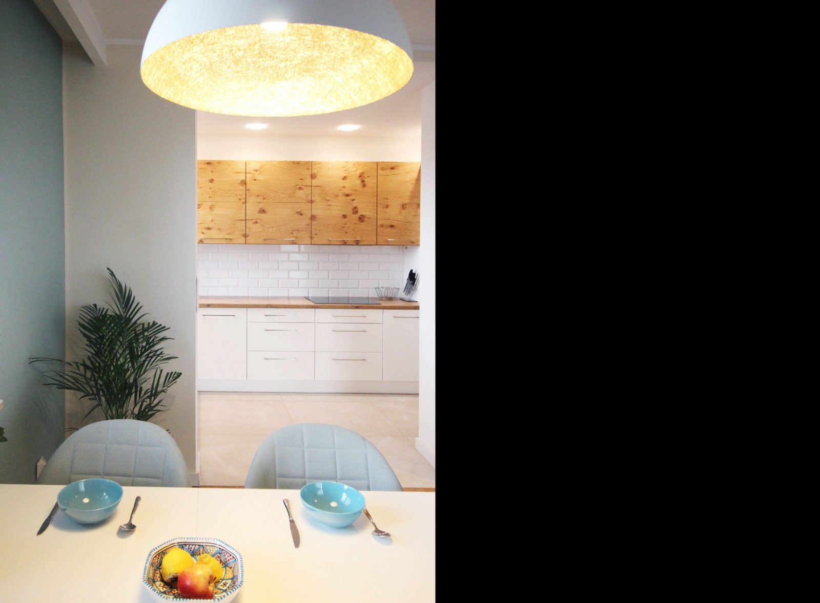 Apartament zaprojektowany dla młodej osoby pracującej. Cała przestrzeń jest utrzymana w jasnych naturalnych kolorach z akcentem niebieskiego.