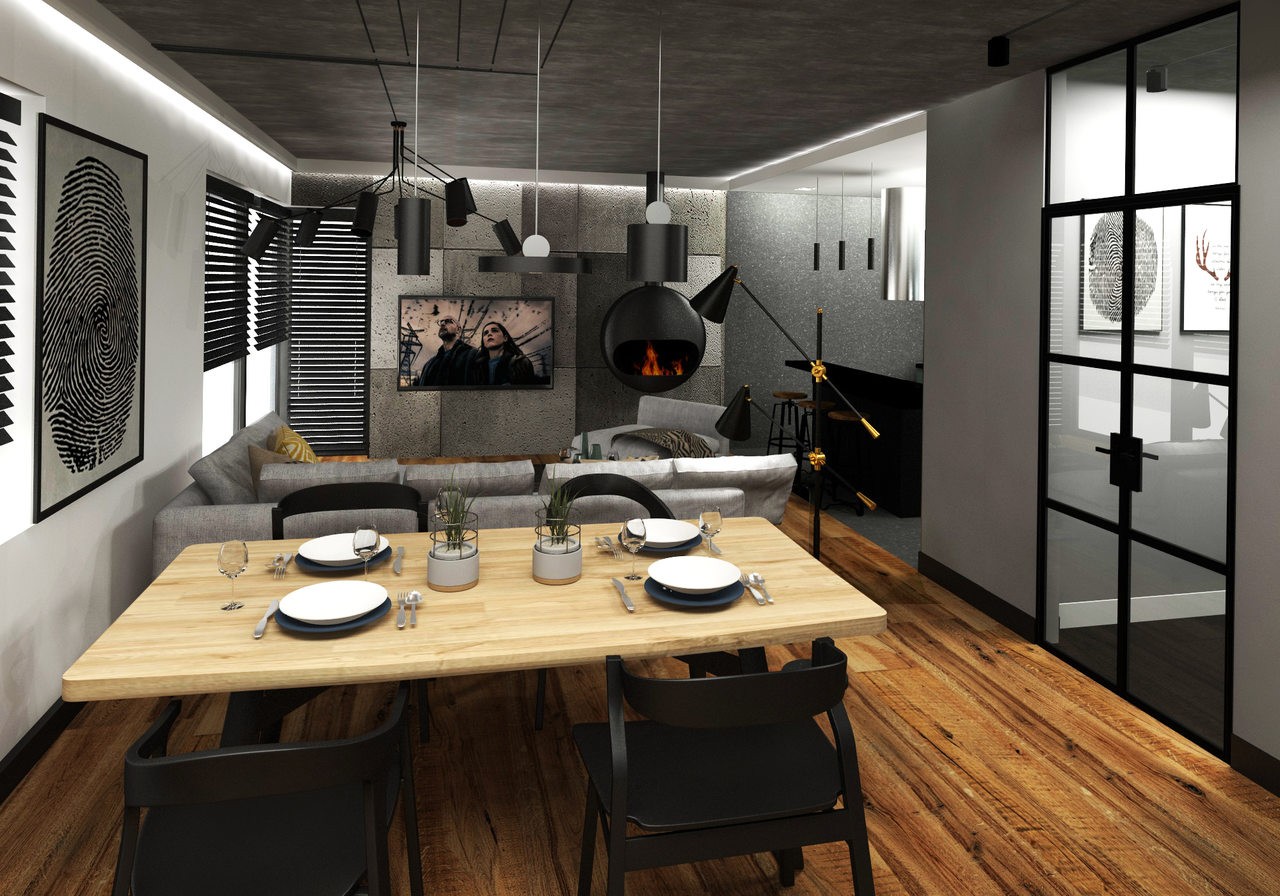 Dom w Modlniczce 125 m2 z dużym salonem połączonym z jadalnią, kuchnią oraz klatką schodową w stylu industrialnym.